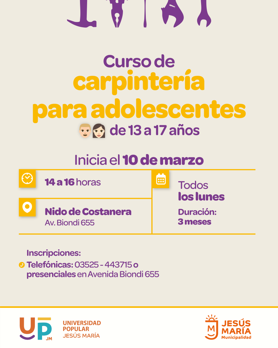 Capacitación para adolescentes de 13 a 17 años en carpintería básica. Se dictará los lunes de 14 a 16 horas. Inicia el 10 de marzo y finaliza el 26 de mayo. Las inscripciones se realizan de manera presencial en el Nido Costanera (Av. Biondi 655) o por teléfono al 03525-443715.